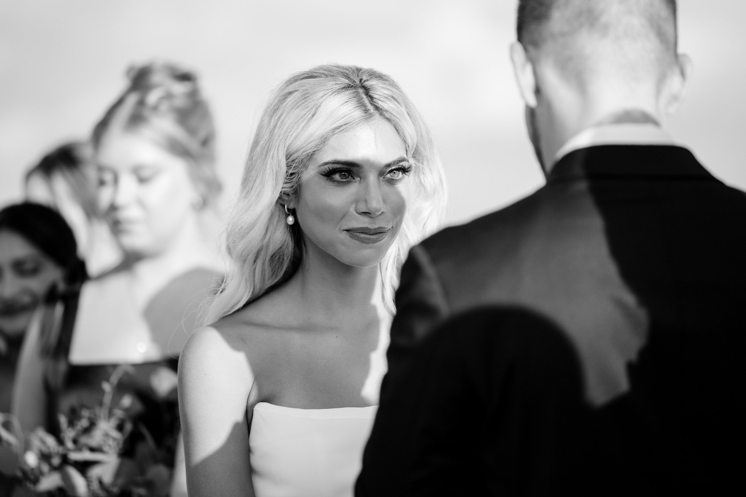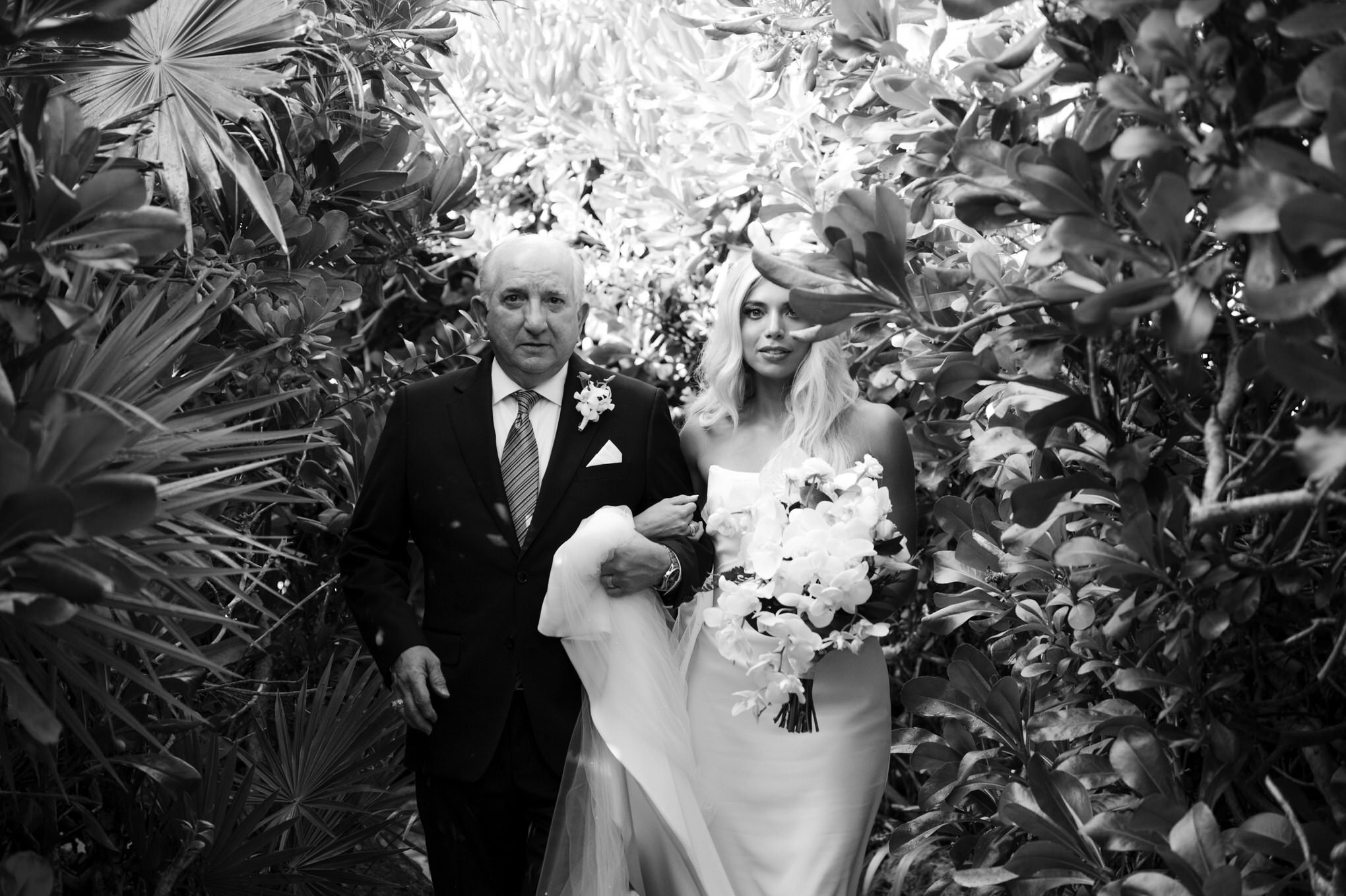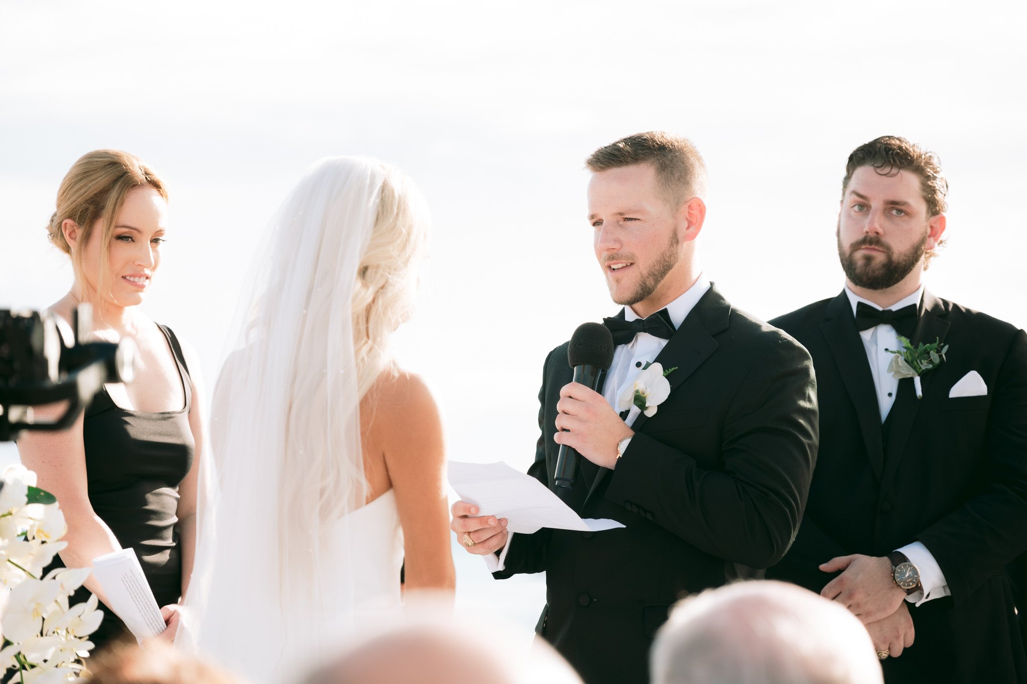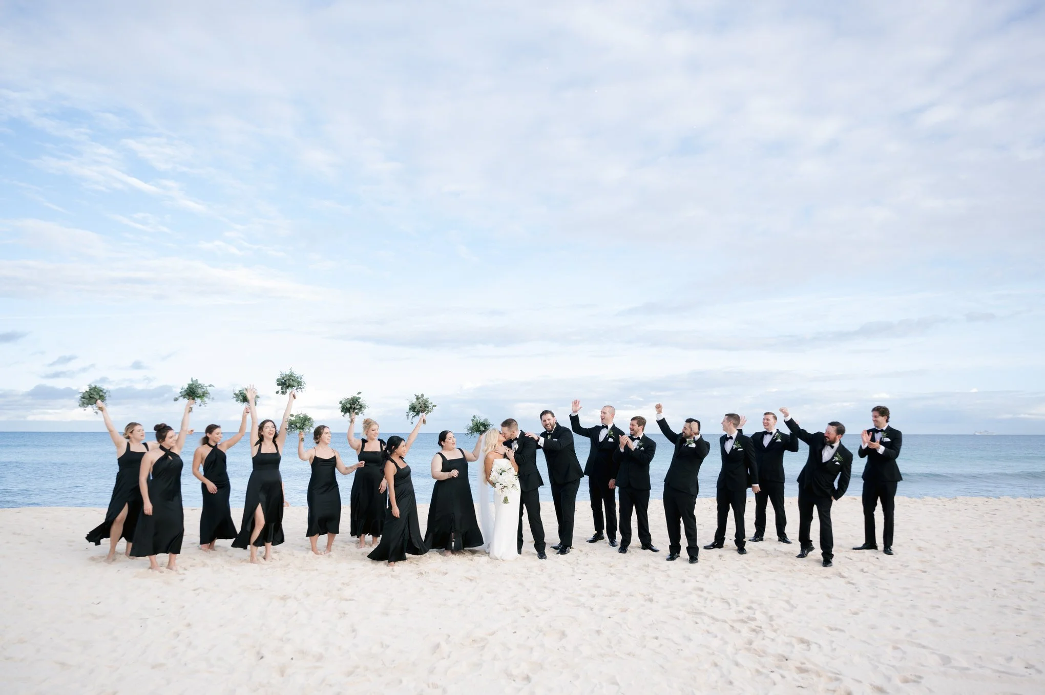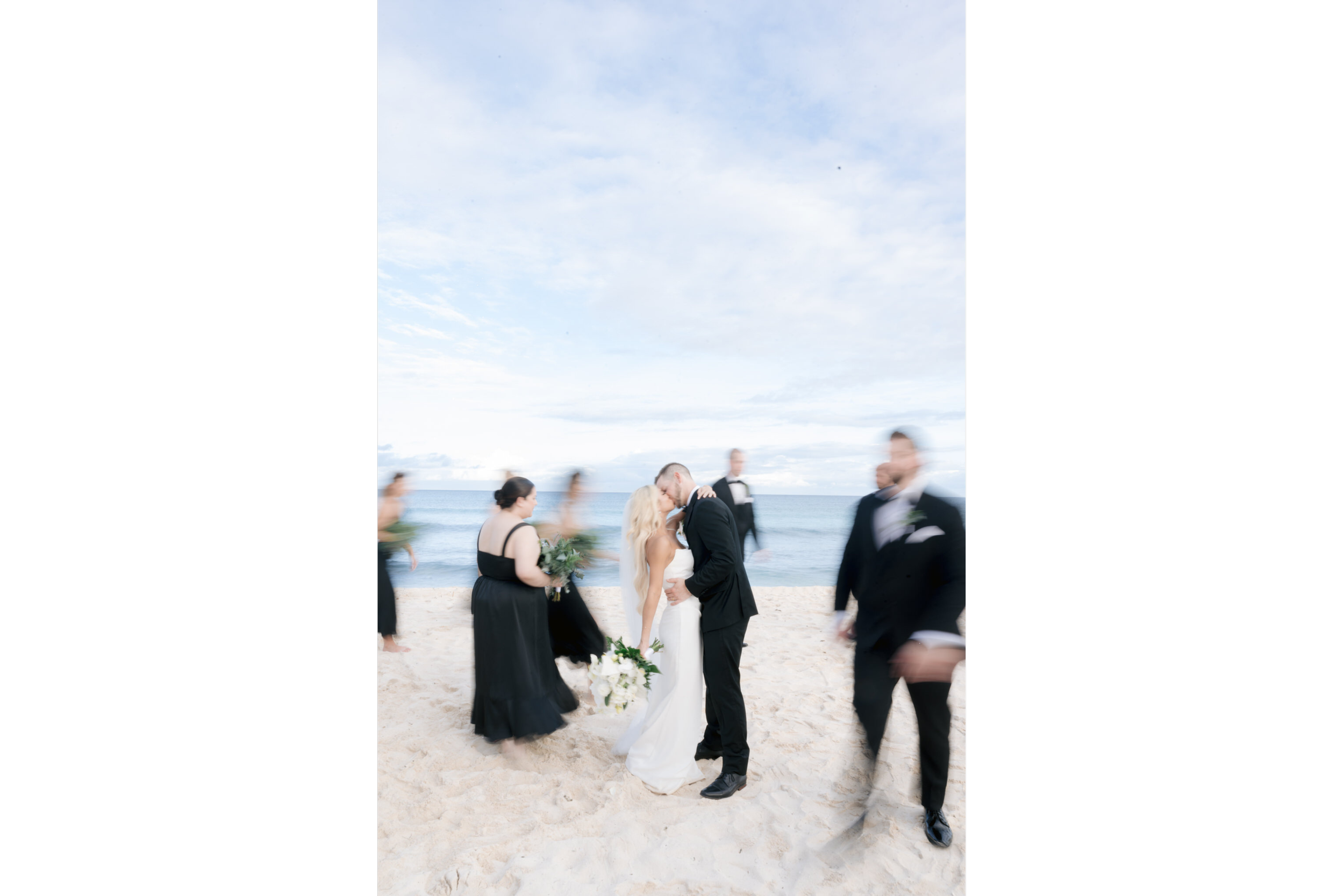 The ceremony took place on the hotel’s private beach, where nature’s own beauty was complemented by a sophisticated 'greenery' theme. Ghost chairs were carefully arranged on the sandy shores, blending effortlessly into the surroundings and creating an almost invisible line between the seating and the majestic ocean backdrop. This setup not only enhanced the natural elegance of the setting but also allowed the vibrant blues of the Caribbean Sea to stand prominently.