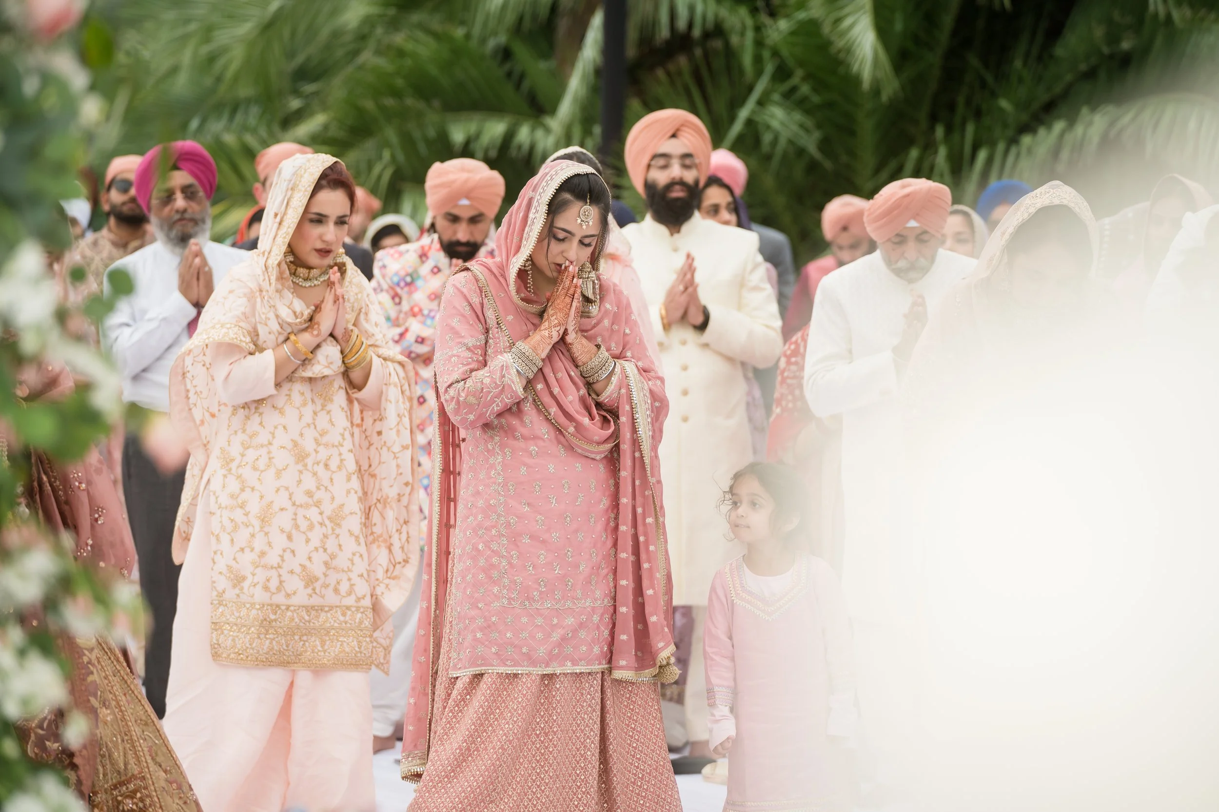 The main ceremony took place on an expansive lawn, transformed into a sacred space with pink floral decorations adorning the Mandap. Guests sat on plush cushions creating an intimate setting that was both welcoming and visually stunning. The focal point was the Guru Granth Sahib, the holy scripture of Sikhism, presided over by a Granthi who conducted the ceremony. The sacred chants and the serene setting offered a profoundly spiritual ambiance that captivated all present.